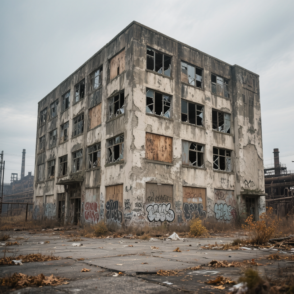 Административное здание бывшего «Эталона» стояло на окраине, у старой промзоны. Когда-то, судя по фотографиям, это была стеклянная коробка с вывеской, символ новых веяний. Теперь же это был унылый бетонный параллелепипед с выбитыми окнами, облезлой штукатуркой и граффити на стенах. Ветер гонял по пустынному двору мусор и опавшую листву. Место, где замерло время и похоронили надежды.