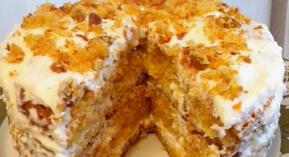 Ингредиенты: - 4 яйца - 1 стакан растительного масла - 350 г сахара - 350 г муки - 40 г тертой моркови - 2 ч. л. разрыхлителя - цедра одного апельсина - 0,5 ч. л. корицы - 150 г грецких орехов - 20 г сливочного масла - щепотка соли Для крема: - 0,5 л густой сметаны - 100 г сливочного масла - сгущенка по вкусу - 2 пакетика закрепителя для сливок - 1 стакан распаренной кураги Приготовление: Грецкие орехи поджарить на сухой сковороде, часто встряхивая, минут десять. Высыпать в чашечку, добавить соль и растопленное сливочное масло. Перемешать и поставить в морозилку. Муку просеять с разрыхлителем. Подмороженные орехи порубить ножом. Курагу порезать. Яйца взбить миксером добела, туда влить растительное масло. Еще взбивать. Ввести просеянную муку с разрыхлителем, вымесить. Добавить корицу, цедру, тертую морковку, орехи. Вымесить. Дно формы (24 см в диаметре) застелить смазанной маслом бумагой для выпечки. В нагретой до 180 градусов духовке выпечь поочередно три коржа. Остудить, каждый завер