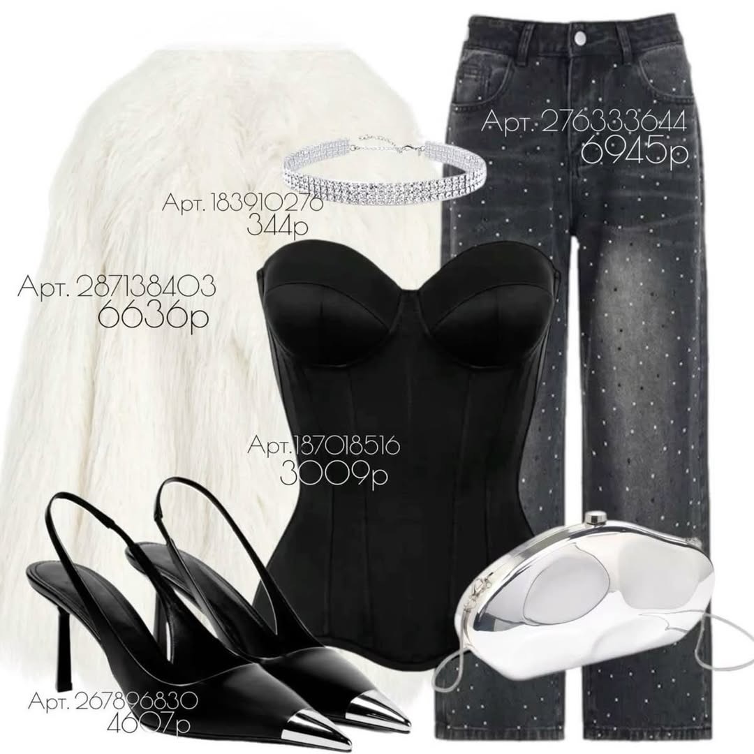 Есть образы, которые будто созданы для особых моментов — тех, когда хочется сиять, чувствовать себя уверенно и позволить себе немного больше, чем обычно. Перед нами именно такой комплект: гламурный, смелый, выразительный, но при этом невероятно гармоничный. Он основан на игре контрастов: глубокий чёрный соединяется с яркой белизной и холодным металлическим блеском. Ниже — стильная, подробная статья о каждой детали, описанной по артикулам, чтобы вы смогли полностью прочувствовать замысел образа. Меховая шубка, артикул 287138403 — нежная роскошь в молочном цвете Шубка белоснежного оттенка будто окутывает мягким светом весь комплект. Она создана для того, чтобы добавлять фактуру, объём и чувственный контраст к гладким и строгим чёрным элементам в образе. Особенности: плотный искусственный мех с красивым «пушистым» эффектом; благородный оттенок топлёного молока, который освежает кожу; идеальная длина для сочетания как с юбками, так и с джинсами. Роль в образе: Шубка работает как роскошн