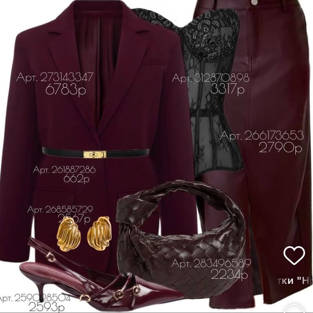 Есть образы, которые не просто украшают женщину — они раскрывают её внутреннюю силу. Глубокий бордовый, благородные фактуры и утончённые аксессуары создают настроение уверенности, зрелой женственности и тонкого вкуса. Это ансамбль, который говорит о характере: он смелый, чувственный, но в то же время невероятно элегантный. Перед вами — детально разобранный комплект, собранный из находок ВБ. Каждая вещь играет свою роль, каждая подчеркивает другую, создавая по-настоящему цельный и выразительный образ. Жакет, артикул 273143347 — благородное вино и архитектурная форма Глубокий винный оттенок жакета — сердце образа. Он создаёт основу, вокруг которой выстраиваются остальные элементы. Прямой силуэт, чёткие лацканы и корректирующая линия плеч делают жакет идеальным для вечерних выходов и особых случаев. Ткань плотная, структурная, держит форму великолепно. Оттенок винного бархата визуально утончает силуэт и придаёт коже красивый теплый тон. Роль в образе: Жакет объединяет все бордовые элеме