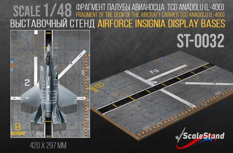 ScaleStand выпустили выставочный стенд фрагмента палубы лёгкого авианосца TCG Anadolu (L-400). Корабль спроектирован с расчётом базирование на нём самолётов F-35B Lightning II. Доступны два варианта палубы: кат. номер St-032 (прямая) и кат. номер St-033 (с наклоном). Размер выставочного стенда 420 х 297 мм. Основание - фанера 4 мм пропитанная маслом + воск + ПВХ 3 мм. + цифровая печать. Поверхность покрыта защитным матовым лаком. 📌 Цена 3000 руб.