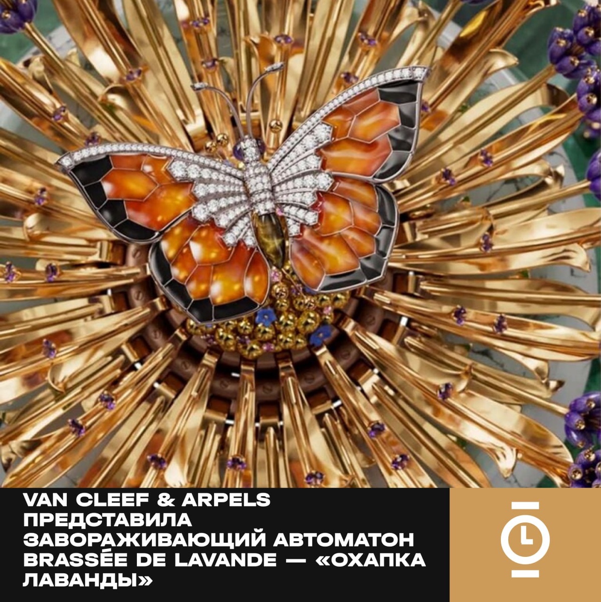 VAN CLEEF & ARPELS ПРЕДСТАВИЛА ЗАВОРАЖИВАЮЩИЙ АВТОМАТОН BRASSÉE DE LAVANDE — «ОХАПКА ЛАВАНДЫ» #новости_WD Ювелирный Дом Van Cleef & Arpels, основанный в 1906 году на площади Вандом, вновь объединяет искусство высокой ювелирной работы, механику и поэзию. В рамках коллекции Extraordinary Objects представлен новый шедевр — Brassée de Lavande Automaton, уникальный автоматон, сочетающий изящество движений, музыку и изысканное мастерство ручной работы. Автоматон выполнен в виде двойной композиции: основание изготовлено из вердита, а время отображается на вращающемся кольце с часовыми метками из жёлтого золота и бриллиантов. Указатели — две миниатюрные улитки из белого золота, скользящие вдоль двух лавандовых побегов. Под зелёным камнем скрываются два независимых механизма: один отвечает за анимацию — раскрытие 36 лавандовых бутонов из розового золота и полёт бабочки, другой — за движение часового кольца. Крылья бабочки выполнены в технике plique-à-jour, благодаря чему они напоминают витр