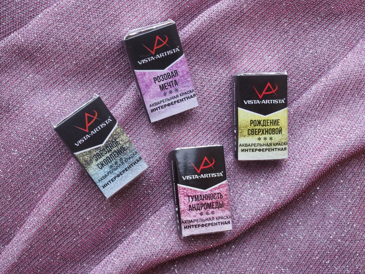 ✨Сияющая новинка! Интерферентные акварельные кюветы Vista-Artista: 930*** Звездное скопление 946*** Розовая мечта 950*** Туманность андромеды 945*** Рождение сверхновой Интерферентная акварель — это вид переливистых красок, блики и блёстки которых меняются в зависимости от угла обзора. пигменты созданы на основе интерферентной слюды. Благодаря прозрачности слоев можно добавлять блестящие эффекты поверх уже готовой работы на светлом фоне или эффектно выделяя детали на черной бумаге. 🪩 Новинка уже доступна в двух наших магазинах: ул. Ленинская, 50 ГУМ Гагаринский