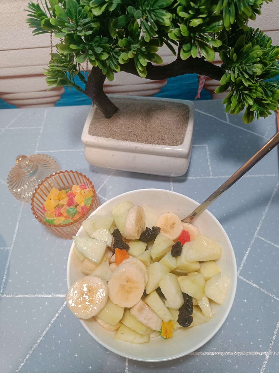Фруктовый салат – это не только вкусное, но и очень полезное блюдо, которое легко приготовить дома. В его состав входят цукаты из ананасов, чернослив, банан, кислое яблоко сорта Симиренко и немного мёда. Такое сочетание ингредиентов придаёт салату интересный и гармоничный вкус: сладость фруктов дополняется лёгкой кислинкой яблока, а натуральный мёд добавляет приятную сладость без лишних добавок. Ингредиенты: - Цукаты из ананасов – 8 г - Чернослив – 37 г - Банан – 109 г - Яблоко кислое (Симиренко) – 130 г - Мёд – 1 чайная ложка Все ингредиенты нарежьте, смешайте и добавьте мёд для легкой сладости. Такой салат прекрасно утоляет жажду, насыщает витаминами и помогает дольше ощущать сытость. По калорийности этот салат считается умеренно лёгким – примерно 298 килокалорий на порцию. Каждый ингредиент вносит свою пользу: чернослив богат клетчаткой и способствует пищеварению, банан насыщает организм калием, а яблоко снабжает витаминами и придаёт свежесть. Цукаты из ананасов добавляют сладкие н