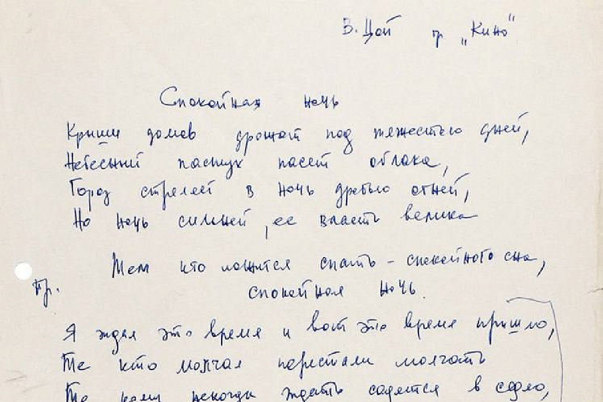 Рукопись песни «Спокойная ночь» Виктора Цоя выставлена на продажу На аукцион выставлена уникальная рукопись песни «Спокойная ночь» группы «Кино», написанная Виктором Цоем. Документ, заверенный подписью Нины Барановской — методиста и