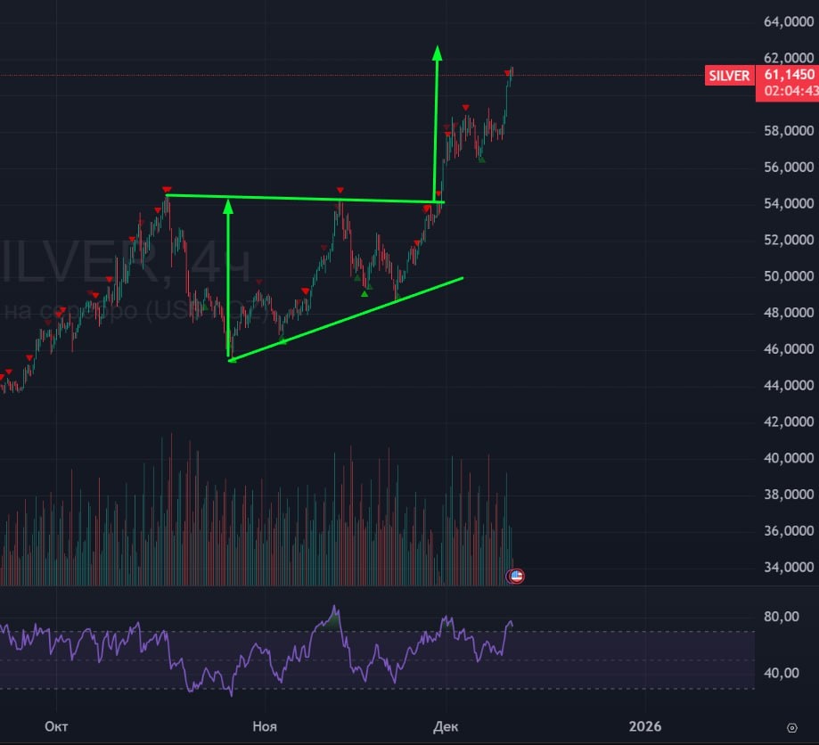 В ответ на пост 🥈 Серебро 🟢 Ранее я писал о треугольнике в серебре и в золоте. 28-го ноября состоялся стремительный выход из треугольника вверх. После чего я ожидал тест треугольника и поход на 62, но теста так и не было, проторговались и пошли выше. 🟢Сейчас цена практически дошла до цели, ожидаю разворот серебра от уровня 62,5. 🚗 Покупать серебро сейчас становится опасным, а сетап в шорт еще не готов. Как минимум буду ждать движение вниз до 54. #Серебро #Silv #Silver #bogdanoffinvest