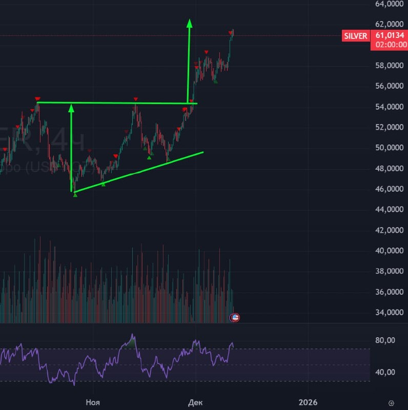 🥈 Серебро 🟢 Ранее я писал о треугольнике в серебре и в золоте. 28-го ноября состоялся стремительный выход из треугольника вверх. После чего я ожидал тест треугольника и поход на 62, но теста так и не было, проторговались и пошли выше. 🟢Сейчас цена практически дошла до цели, ожидаю разворот серебра от уровня 62,5. 🚗 Покупать серебро сейчас становится опасным, а сетап в шорт еще не готов. Как минимум буду ждать движение вниз до 54. #Серебро #Silv #Silver #bogdanoffinvest