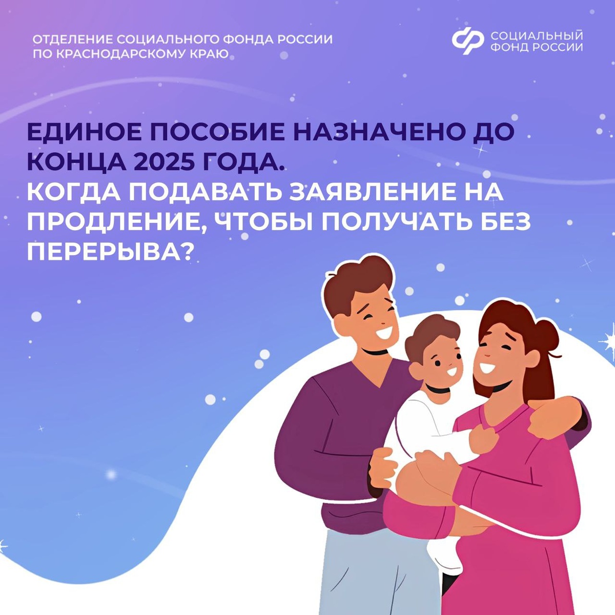 ❓ Единое пособие назначено до конца 2025 года. Когда подавать заявление на продление, чтобы не было перерыва в выплатах? Единое пособие назначается на 12 месяцев. Чтобы продолжить его получение в следующем году, подавайте заявление: 🩵 в последний месяц текущего периода (декабрь 2025 года) 🩵 или в течение месяца после окончания текущего периода (январь 2026 года) В обоих случаях пособие будет назначено с января по декабрь 2026 года. ➡️ На что влияет месяц подачи заявления? ✔️ На расчетный период для выплат ✔️ На сравнение дохода и процентов по вкладу с прожиточным минимумом ✔️ На лимит дохода ✔️ На размер алиментов без решения суда ☎️🏠 Если остались вопросы, то всегда можно обратиться в единый контакт-центр СФР 8(800)100-00-01 или лично в клиентскую службу Отделения СФР по Краснодарскому краю. 📲👉 Подписывайтесь на наш канал в MAХ и будьте в курсе всех мер соцподдержки ❗️ #СФР #единоепособиесфр