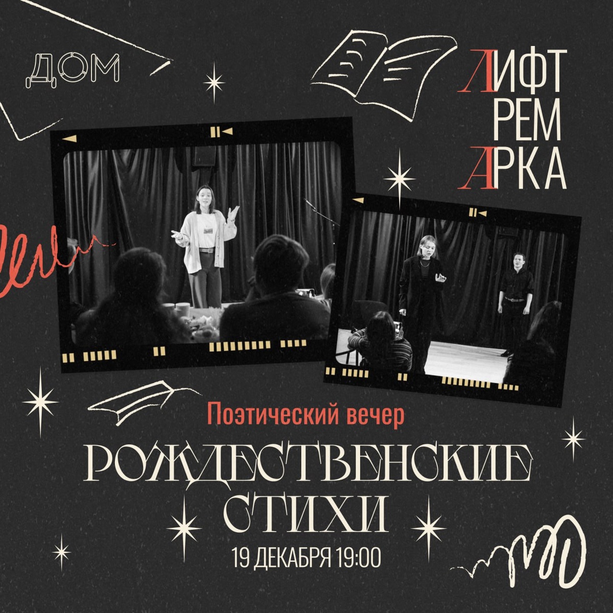 ✨Театральная студия «Лифт РемАрка» приглашает на поэтический вечер «Рождественские стихи» Вечер, когда все вокруг замирает, слова превращаются в маленькое чудо, а сердца слушателей наполняются светом и радостью! Здесь каждый желающий может принять участие! Даже если твои любимые стихи совсем не про Рождество, ты все равно можешь поделиться частичкой души со всеми! Для участия пиши в личные сообщения руководителю студии Петру Лебедеву! 🗓 19 декабря | 19:00 Забирай свой билет! Приходи с хорошим настроением, любимыми стихами и печеньками к чаю! Ждем именно тебя❤️
