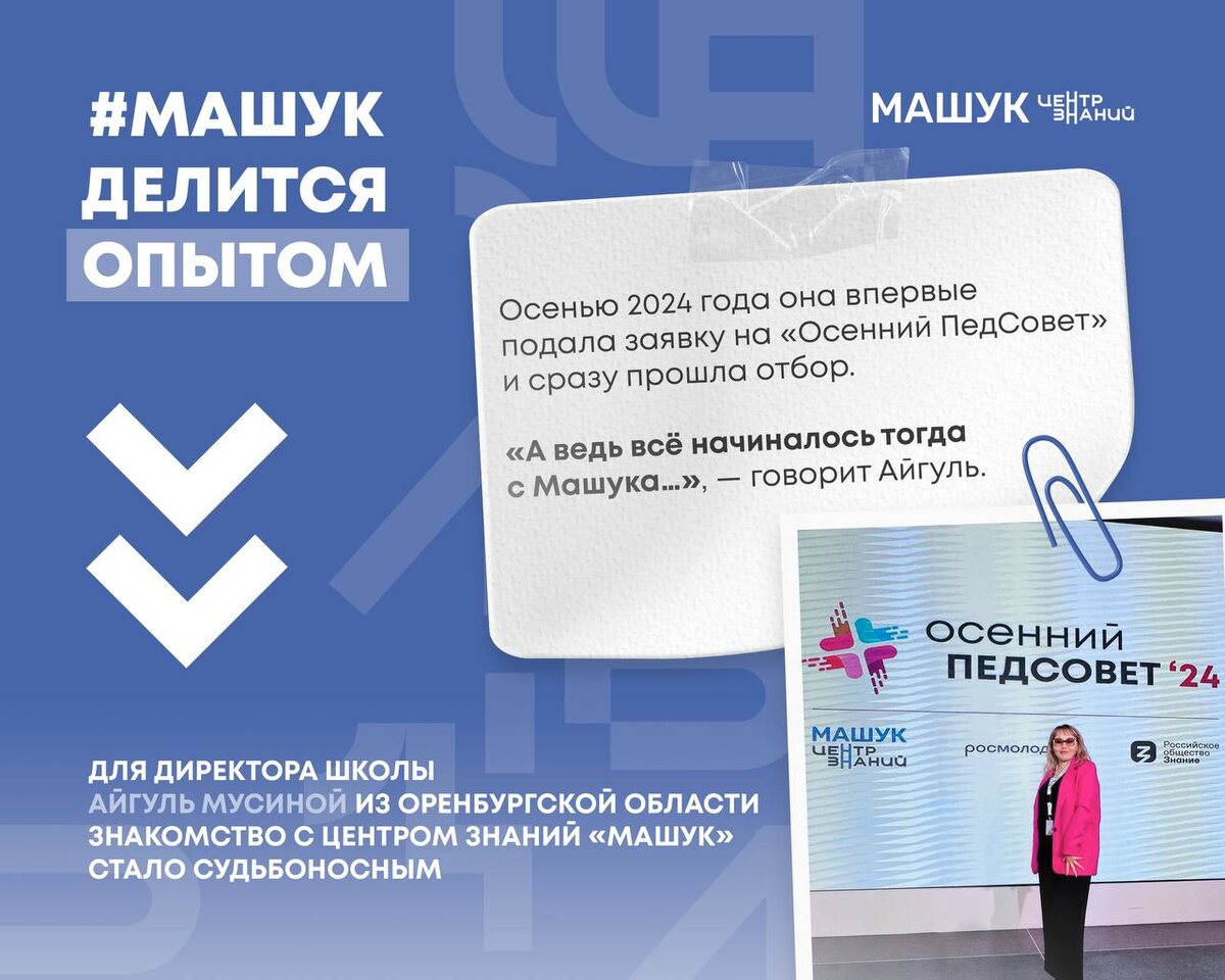 💙 Один маленький шаг = большие перемены Сегодня в рубрике #МашукДелитсяОпытом — Айгуль Мусина. Осенью 2024 года ее первый «Осенний ПедСовет» стал точкой роста, открывшей новые возможности и идеи. 📎 После программы Айгуль смогла открыть для себя вдохновение, найти новые идеи для работы и ощутить, что возможности вокруг огромные, стоит лишь сделать шаг навстречу. «Машук» становится местом, где идеи рождаются, растут и вдохновляют на новые шаги. А история нашей героини тому живое подтверждение. Подробности в карточках выше.👆