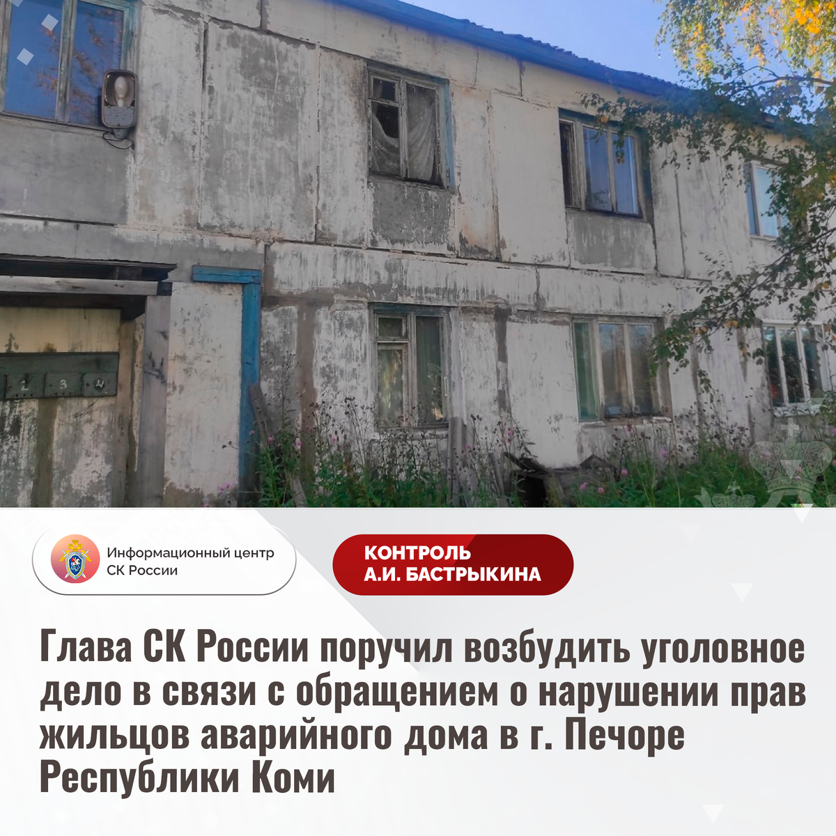 Глава СК России поручил возбудить уголовное дело в связи с обращением о нарушении прав жильцов аварийного дома в г. Печоре Республики Коми