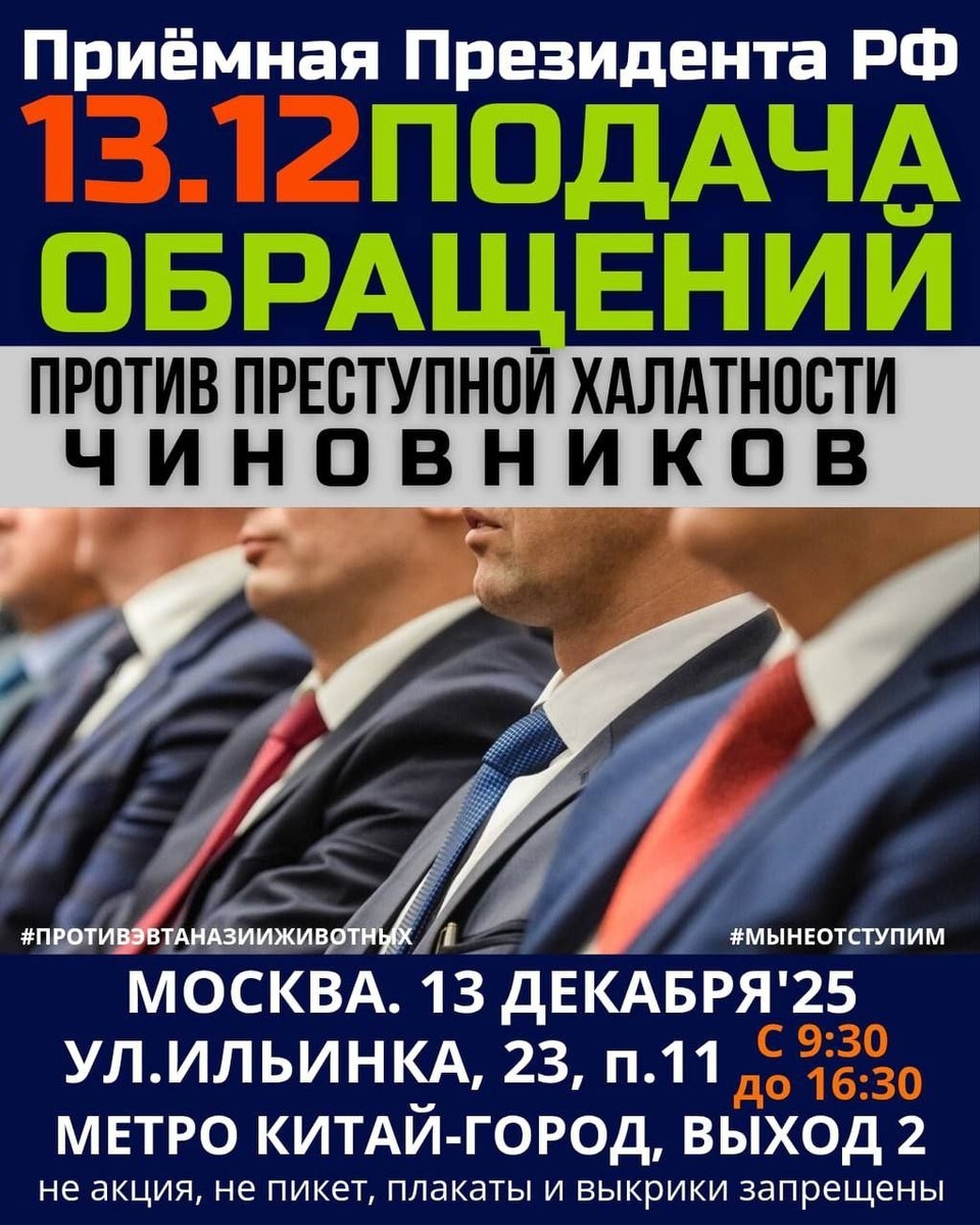 🔴🔴🟠🟠🔴🔴🟠🟠🟠 РОССИЯ! ЛЮДИ! ГРАЖДАНЕ! 🔴🔴🔴13 ДЕКАБРЯ СОСТОИТСЯ ВСЕРОССИЙСКАЯ ПОДАЧА ОБРАЩЕНИЙ в АДМИНИСТРАЦИЮ ПРЕЗИДЕНТА РОССИИ ПРОТИВ ЖИВОДЁРСКИХ ЗАКОНОПРОЕКТОВ!!! Приходите все милосердные к животным люди, кому небезразлична судьба нашей Страны!! 🔴В ПРЕДДВЕРИИ ПРЯМОЙ ЛИНИИ С ПРЕЗИДЕНТОМ РОССИЙСКОЙ ФЕДЕРАЦИИ КАК НИКОГДА ВАЖНО ВЫСКАЗАТЬ СВОЮ ПОЗИЦИЮ ПО РАСЧЕЛОВЕЧИВАНИЮ ОБЩЕСТВА И КРОВАВОМУ РАСПИЛУ РЕГИОНАЛЬНЫХ БЮДЖЕТОВ! 🟠НЕ ЛЕНИТЕСЬ И НЕ ОТСИЖИВАЙТЕСЬ! Они плюют на мнение и безопасность людей, на Конституцию, на Федеральный закон, на Поручения Президента, на решение Конституционного суда! Они готовы тратить МИЛЛИАРДЫ БЮДЖЕТНЫХ ДЕНЕГ НА ЖЕСТОКОЕ УБИЙСТВО! 🙅♂️В стенах ГосДумы РФ уже запущены процессы по раскачке населения и расколу общества! Тенденция по ужесточению законов в отношении животных уже приводит к социальной напряжённости и обострению конфликтов! Не думайте, что живодерские проекты Останиной вас не коснутся. Коснутся. Неминуемо. Уже звучат предложения огр