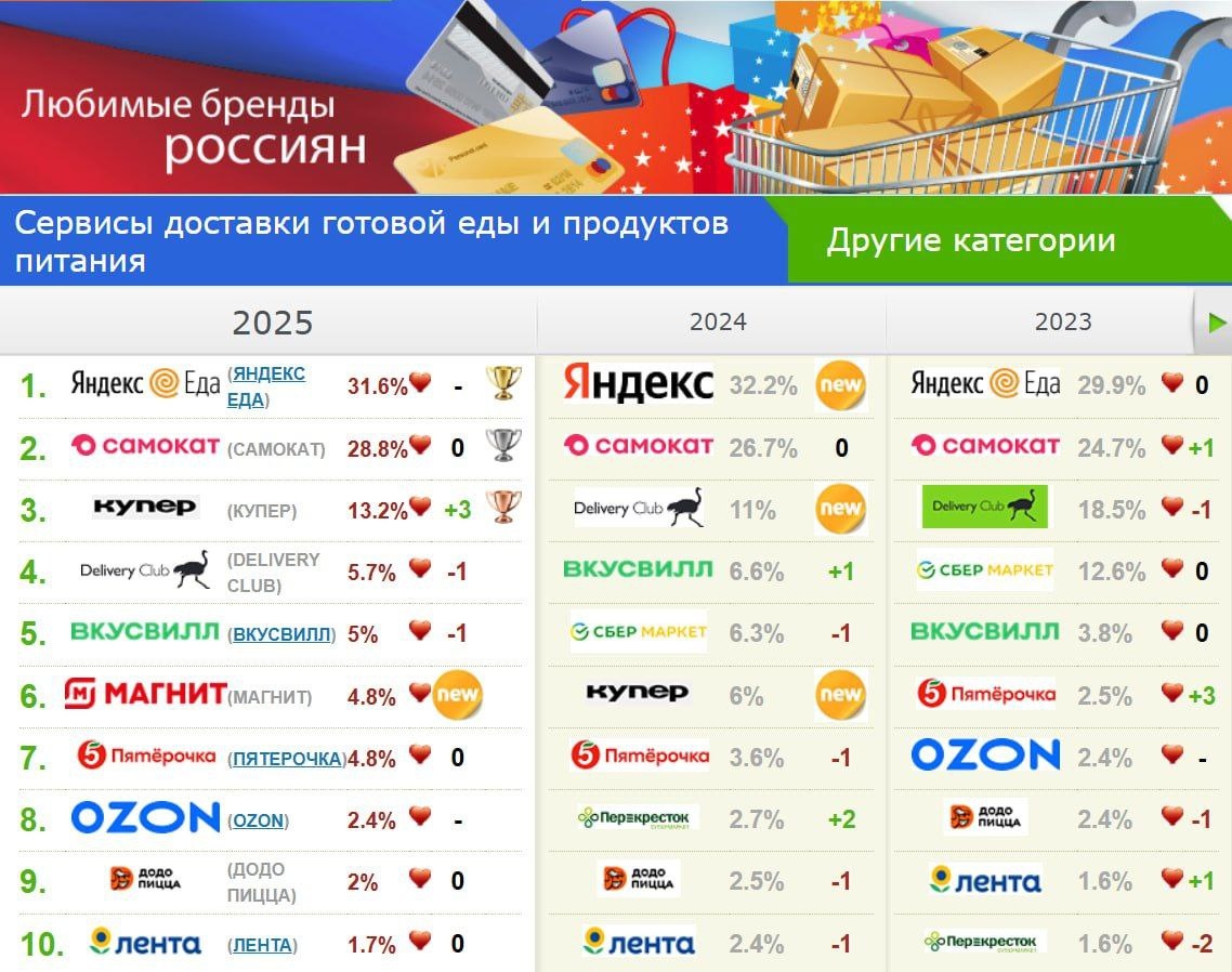 - Появление нового игрока: В рейтинг входит «Купер» (6%) — сервис экспресс-доставки из ресторанов.