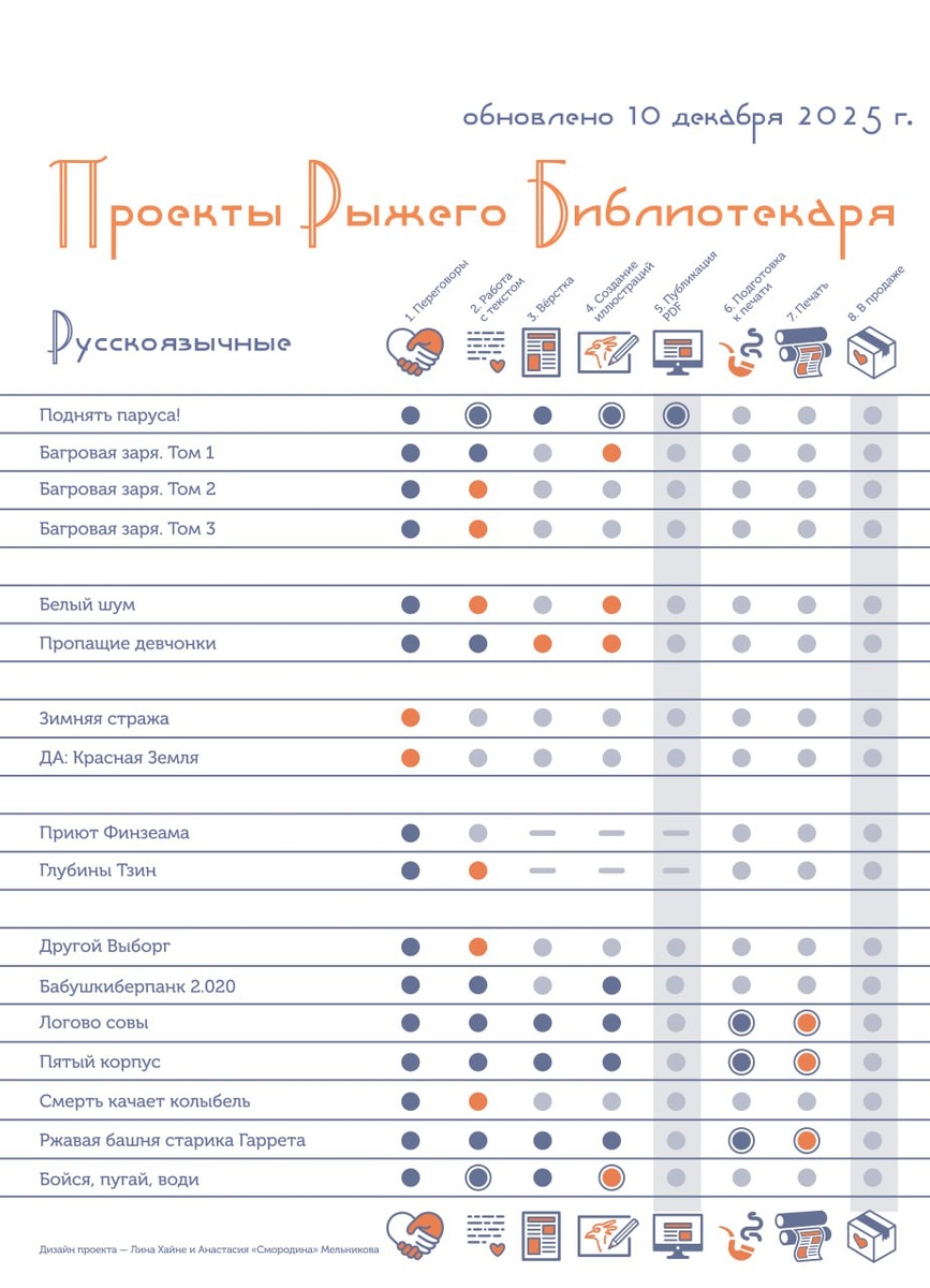 Статусы проектов Библиотекаря на начало декабря Публикуем актуальные статусы проектов «Рыжего Библиотекаря» на декабрь 2025 года. Вот что мы успели сделать за прошедший месяц: 1. Mausritter в печати. Приехали коробки для мышей и ширма. Прямо на станках сейчас «Логово совы», «Пятый корпус» и «Ржавая башня». 2. Продолжаем поддерживать линейку «Savage Worlds: Дневник авантюриста»: ○ Вышла цифровая версия фантастического приключения «Луна над бездной». ○ Завершён перевод приключения «Гранд-Атом: обратный отсчёт». ○ Перевод «Мёртвых земель» перезапущен. 3. Состоялся релиз «Поднять паруса!». Игра про пиратов от Ксении Таргулян и Фёдора Кукина уже на «Станции “Ролевая”». 4. Завершена вторая корректура руководства по играм в жанре хоррор от Фёдора Кукина «Бойся, пугай, води». Идёт иллюстрирование. Условные обозначения: 🔵 — этап завершён. 🟠 — в процессе. ⚪️ — запланирован. ➖ — не нужен. Кольца Сатурна — обновлённые статусы.