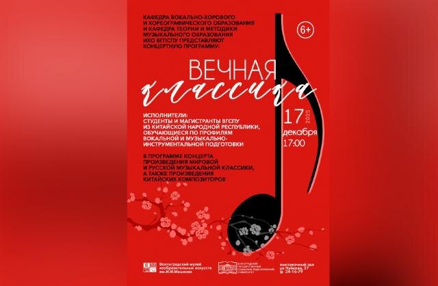 Выставочный зал Волгограда представит концерт «Вечная классика». В нём выступят студенты и магистранты из Китая, проходящие обучение в Волгоградском государственном социально-педагогическом университете. Прозвучат произведения мировой и русской музыкальной классики: арии из опер В.-А. Моцарта «Свадьба Фигаро», В. Беллини «Пуритане» и П. Чайковского «Иоланта», романсов на музыку С. Рахманинова, А. Даргомыжского, Н. Римского-Корсакова и русских народных песен «У зори-то, у зореньки», «Волга-реченька», «Как по лужку травушка», «Эх, Настасья». Концерт состоится 17 декабря (ул. Чуйкова, 37), начало в 17 часов. 6+