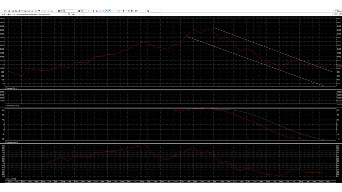 Новостной фон ухудшается, рубль уходит в коридор 85-90, Центральный банк РФ отказался понижать ставку до января 2026 года. Компания Позитив сообщает своим инвесторам о тяжелом экономическом своем положении. Спрос на продукт компании медленно понижается, хотя прилагаются максимальные усилия для расширения спроса на товар. К концу 2025 года акции не получается удержаться на уровне 1000, она подошла к линии сопротивления понижающегося коридора. К середине января 2026 года медведи загоняют акцию в этот коридор. К концу января акция достигает уровня 800 или находится ниже уровня 800.