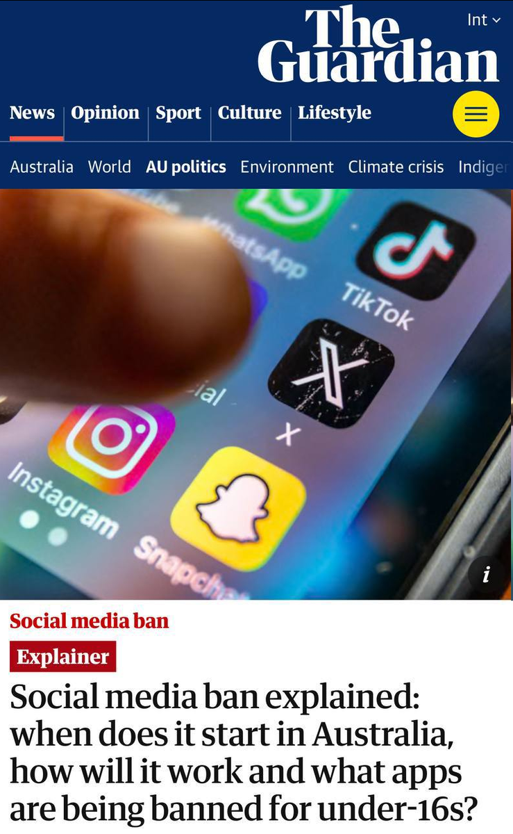 Австралия первой в мире полностью запрещает соцсети для детей до 16 лет. Под запретом с 10 декабря Facebook, Instagram, Threads, X, YouTube, Snapchat, Reddit, Kick, Twitch и TikTok. Как говорится, выйдите во двор, поиграйте с кенгуру… Что скажете? Я скорей за. Может быть, до 14. Но мы к этому придём.