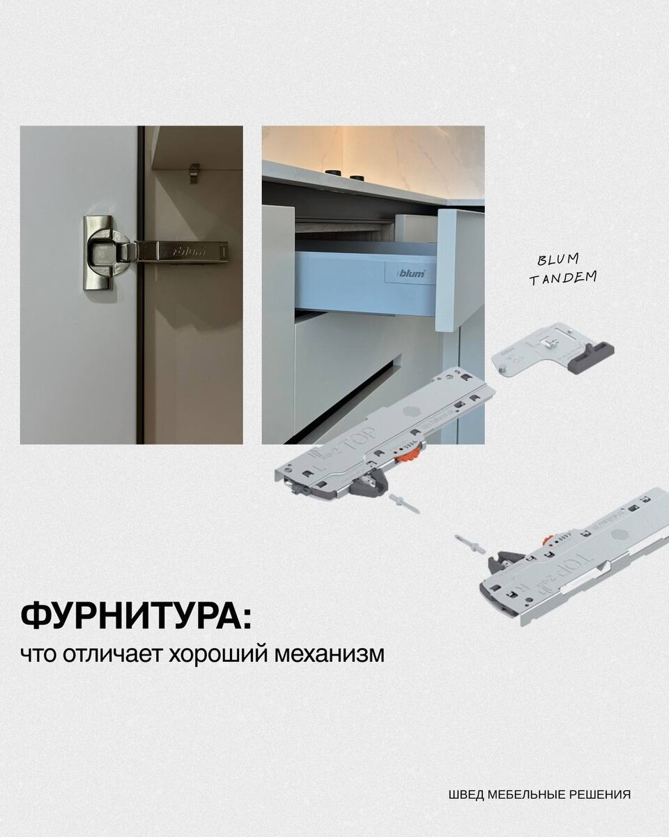Хорошая фурнитура — это ровный ход. Не “мягкий”, не “эффектный”, а одинаковый на первом и на сотом открывании. Без люфта. Без провала. Без шума конструкции. У нее стабильная посадка. Фасад не уходит, зазор не меняется и линия остается чистой. Средний механизм плавно «проседает» — его видно по миллиметрам. Хороший механизм выдерживает нагрузку: вес фасада, боковые усилия, вибрации, некоторые перекосы стен. Он отлично работает в реальных сценариях жизни. И главное — работа механизма спустя время. У качественной фурнитуры изнашиваются только расходники, в то время как у средней раскачиваются сами узлы. Она работает ровно и остается незаметной, как и должно быть в правильной конструкции.