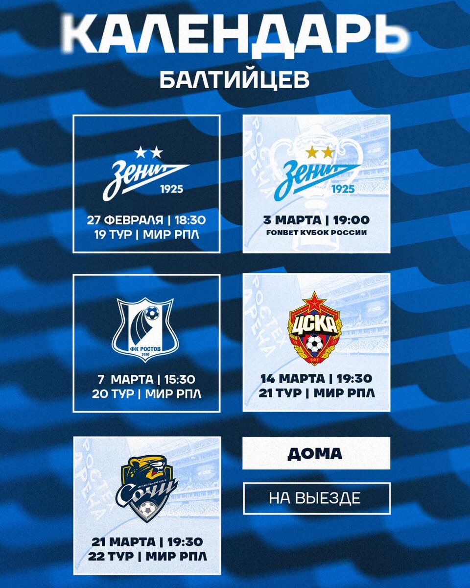 КАЛЕНДАРЬ ⚽️ Стало известно расписание матчей с 19-го по 22-й туры Российской Премьер-лиги, а также игр второго этапа четвертьфинала FONBET Кубка России. 🐻 «Зенит» 💙 — 💙 «Балтика» 📆 27 февраля; ⏰ 18:30. 🏆 «Балтика» 💙 — 💙 «Зенит» 📆 3 марта; ⏰ 19:00. 🐻 «Ростов» 💙 — 💙 «Балтика» 📆 7 марта; ⏰ 15:30. 🐻 «Балтика» 💙 — 💙 ЦСКА 📆 14 марта; ⏰ 19:30 🐻 «Балтика» 💙 — 💙 «Сочи» 📆 21 марта; ⏰ 19:30.