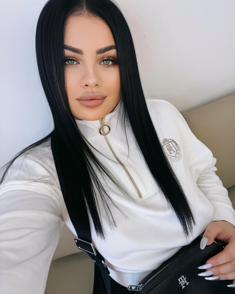 На этом снимке запечатлена девушка, словно сошедшая со страниц модного журнала. Её длинные, как шёлковая завеса, чёрные волосы ниспадают по плечам, обрамляя лицо безупречной симметрией. Взгляд её — глубокий, завораживающий, будто в нём таится целый мир тайн и эмоций. Глаза, полные жизни, смотрят прямо в душу, а чётко очерченные брови придают облику особую выразительность.