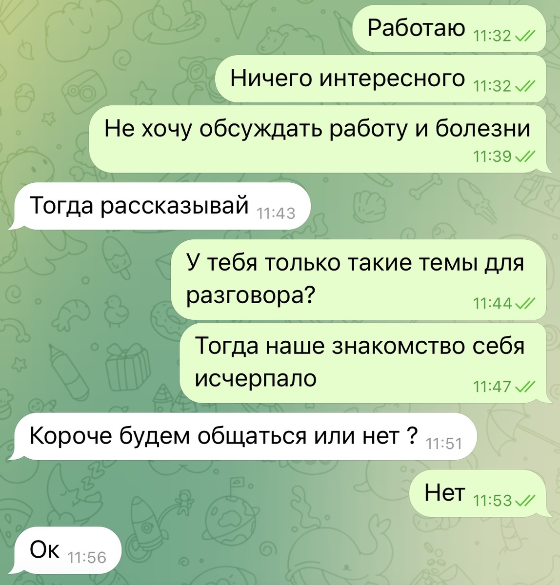 В тот день он написал мне доброе утро и рассказал о планах своего рабочего дня. Я почувствовала себя так, будто сьела что-то кислое. И решила больше с ним не общаться. Вот так он потерял все мои улыбки и дружелюбие. В тот момент, когда я решила не тратить на него время, его корона Главаря свалилась с головы. Больно, с грохотом. Он испытал шок. Для меня все это так логично и предсказуемо, я давала ему шансы, снисходя до этих скучных разговоров. А он отказывался от шансов в этой короне своей, считая, что справится и без этого. Я же прочувствовала все это на себе так, что мне не понравилось и не захотелось. Увидели эту брошенную сверху вниз фразу «Тогда рассказывай»? Эта фраза прозвучала так, словно я должна его еще и развлекать. Какая мерзость.