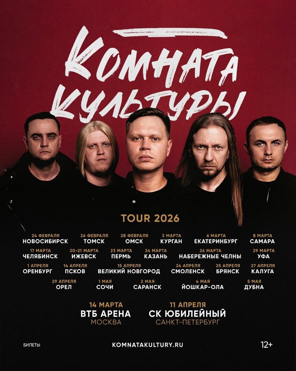 🎫 – Комната культуры: большой тур в 2026 году 🎤 – Комната культуры 📍 – 25 городов: Новосибирск, Томск, Омск, Курган, Екатеринбург, Самара, Челябинск, Ижевск, Пермь, Казань, Набережные Челны, Уфа, Оренбург, Псков, Великий Новгород, Смоленск, Брянск, Калуга, Орёл, Сочи, Саранск, Йошкар-Ола, Дубна, Москва, Санкт-Петербург 🗓 – 24 февраля 2026 – 5 мая 2026 💵 – от 2 000 руб. 🔗 – билеты (12+) #концерты #билетынаконцерт #комнатакультуры #новосибирск #томск #омск #курган #екатеринбург #самара #челябинск #ижевск #пермь #казань #набережныечелны #уфа #оренбург #псков #великийновгород #смоленск #брянск #калуга #орёл #сочи #саранск #йошкарола #дубна #москва #санктпетербург 👉 Список концертов: декабрь 2025 • январь 2026 @est_prohodka