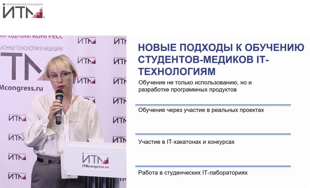 В Приволжском исследовательском медицинском университете ушли от стандартного обучения информационным технологиям. В ПИМУ студентов обучают не только использованию, но и разработке программных продуктов с фокусом на получение практического опыта, на участие в IT-хакатонах и конкурсах, на работу в студенческих IT-лабораториях. О том, как это происходит, на площадке “ИТМ 2025” рассказала заведующий кафедрой информационных технологий ПИМУ, кандидат биологических наук Анна Баврина. “Подчеркну, все студенты лечебного факультета ПИМУ без исключения на первом курсе проходят дисциплину “Информационные технологии”, в рамках которой изучают три языка программирования; на втором курсе - “Системы искусственного интеллекта”, где они также учатся разрабатывать подобные системы. На третьем курсе сейчас ничего нет, но со следующего учебного года вводится специальность “Виртуальная, дополненная и смешанная реальность”. На четвертом курсе - “Медицинские информационные системы”, - пояснила Анна Баврина.