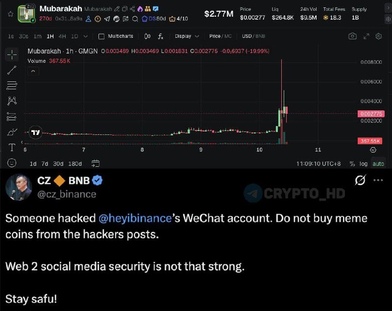 #взлом #скам ❌ Хакер взломал аккаунт Binance в WeChat и пропиарил мемкоин #MUBARAKAH, заработав $55,000. CZ: Безопасность WEB2-соцсетей не отличается высокой надежностью. Crypto Headlines