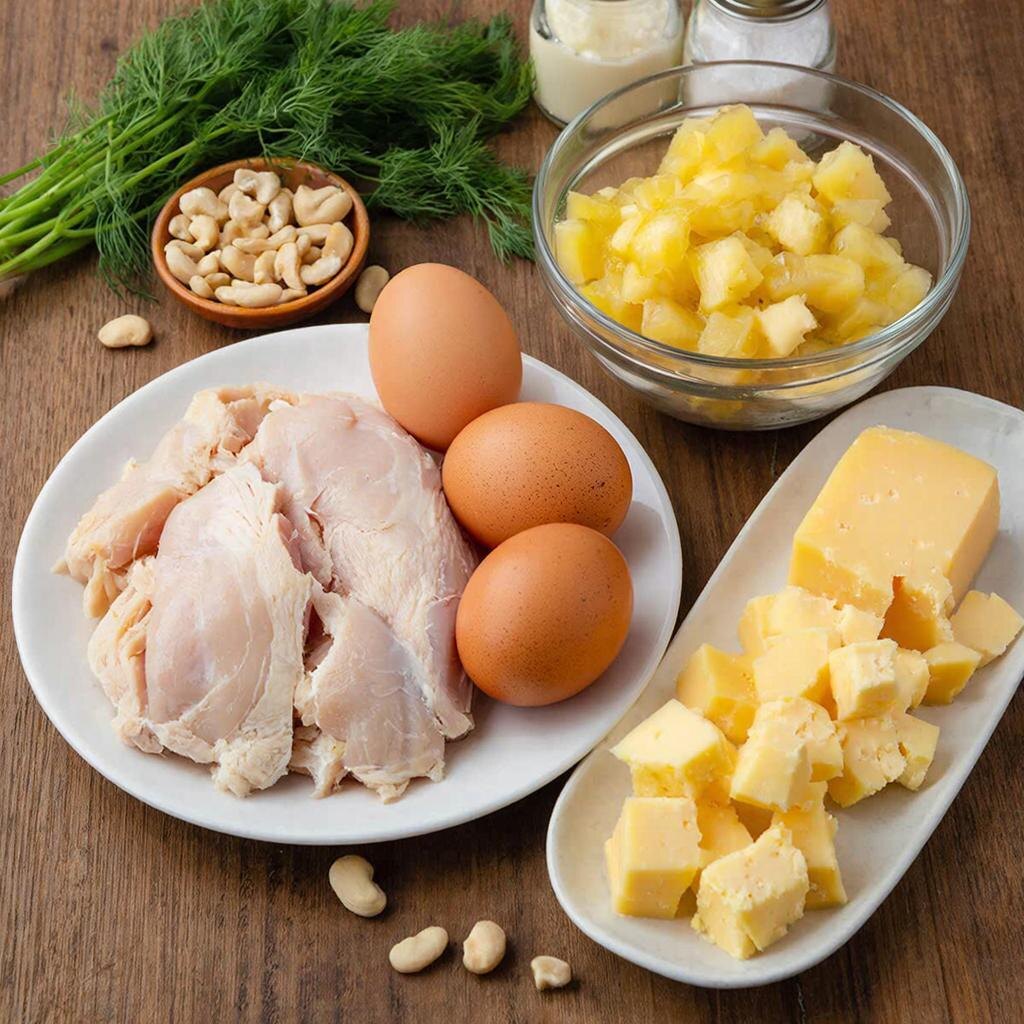 Салат «Звездные сплетни» — это не просто блюдо, а настоящая кулинарная звезда, которая украсит любой праздничный стол. Его яркий и аппетитный вид, а также гармоничное сочетание ингредиентов порадуют даже самых взыскательных гурманов. Давайте подробнее рассмотрим, как приготовить этот салат и какие секреты помогут сделать его еще более вкусным. Ингредиенты Для приготовления салата потребуются: 250-300 г куриного филе (можно использовать филе с бедра для большей сочности) 3 яйца 200 г консервированных ананасов (кусочками или полукольцами) 150 г полутвёрдого сыра (например, «Гауда» или «Российский») 50 г кедровых орешков 4 ст. л. майонеза Соль по вкусу Зелень для украшения (петрушка или укроп) Приготовление Подготовка ингредиентов В первую очередь, отварите куриное филе в подсоленной воде. Важно не переварить мясо, чтобы оно не стало сухим. Достаточно варить его 15-20 минут до полной готовности. После варки остудите филе и нарежьте его небольшими кубиками или разберите на волокна. Если