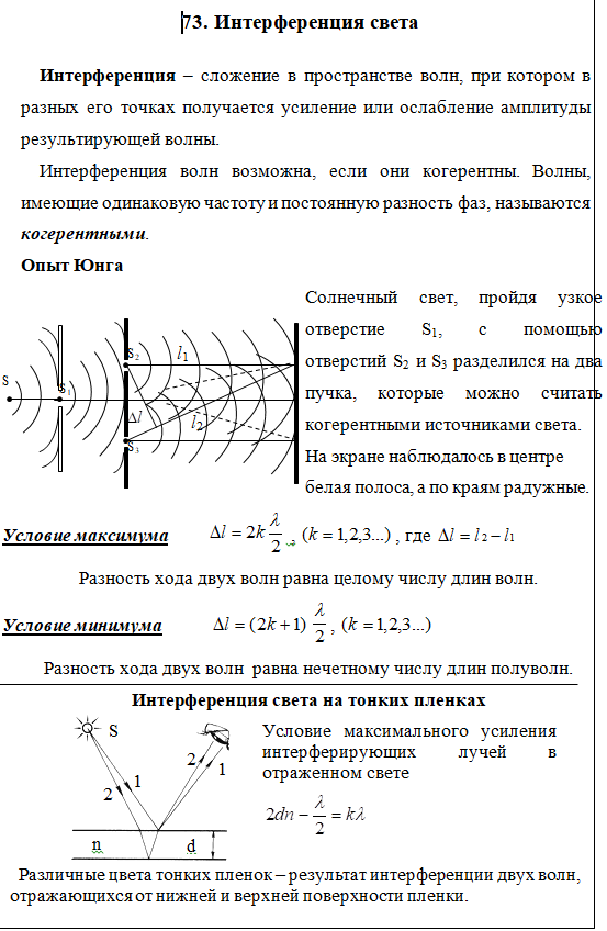 Подготовка к ЕГЭ по физике. Конспект №73 «Интерференция света» с описанием.