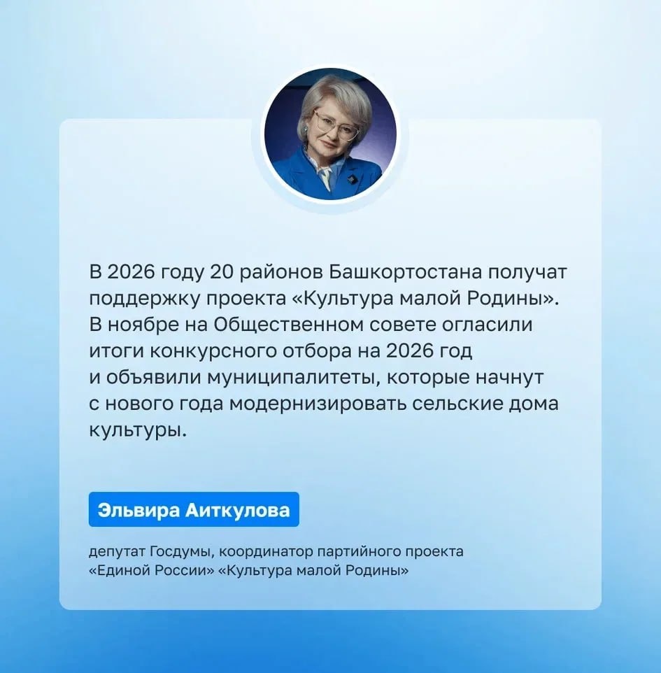 Башҡортостан - "Бәләкәй Ватан мәҙәниәте" федераль проектын тормошҡа ашырыуҙа лидер Республика 2017 йылдан алып программала өс йүнәлеш буйынса әүҙем ҡатнаша: «Урындағы мәҙәниәт йорто», «Балаларға театрҙар», «Бәләкәй ҡалалар театрҙары». Бөтә осорҙа дөйөм финанслау 894,8 миллион һум тәшкил итә, шул иҫәптән федераль бюджеттан 834,9 миллион һум. Быйыл 401 мәҙәни-ял итеү учреждениеһының матди-техник базаһы яҡшыртылған, шул иҫәптән 13 объектта ағымдағы ремонт үткәрелгән, шуның арҡаһында 28 мәҙәниәт йорто ауылдың күп функциялы клубтарына әйләнгән. Республиканың мәҙәниәт йорттары быйыл ниндәй ярҙам алды – карточкаларҙа. "Таң" гәзитенә ҡушылығыҙ: ➡️ МАХ-канал😄ТГ-канал