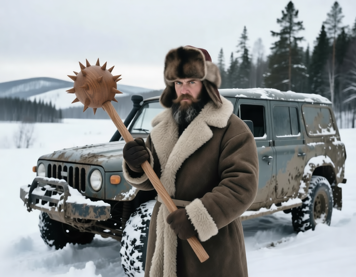 Те трое замерли. Посмотрели на Диму: ушанка торчит в разные стороны, физиономия небритая, полушубок местами драный, а в руках – тяжёлая деревянная булава, как у настоящего викинга или древнерусского воина. Они переглянулись, явно не ожидали такого поворота. Молчаливо развернулись, сели в машину и уехали, даже не сказав ни слова.