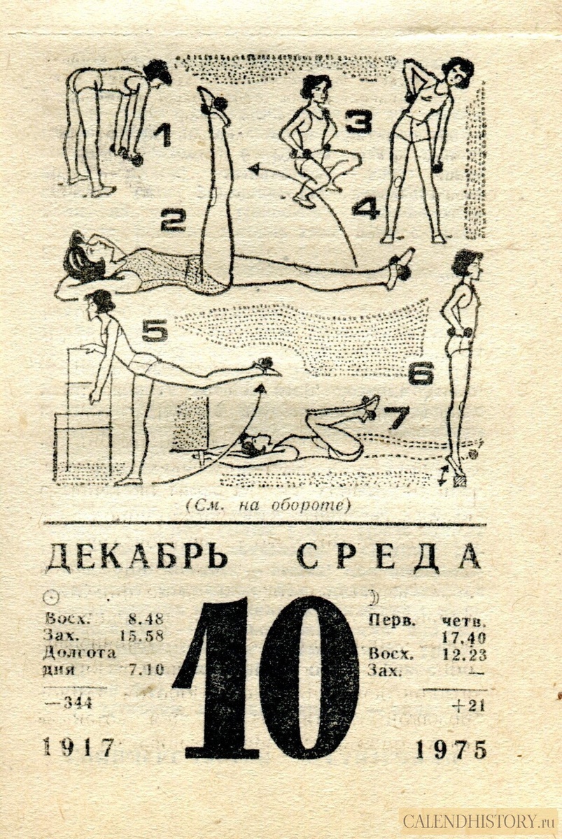 Листок советского отрывного календаря 50-летней давности 10 декабря 1975-го года — Календарь для женщин КОМПЛЕКС ТРЕТИЙ — С ГАНТЕЛЯМИ 1. Наклоны туловища вперед — вниз. Вес гантелей 3(5) кг. И. п. ноги на ширине плеч, руки с гантелями опущены вниз, ладони назад. Наклониться вперед — вниз возможно ниже, для чего сделать два-три пружинящих движения с одновременным движением рук вниз; вернуться в и. п. При наклоне — выдох, при выпрямлении — вдох. Темп медленный и средний. Повторить 6-8 раз. Отдых 1 мин. После отдыха то же самое упражнение повторить 4-6 раз с гантелями весом в 5 кг. Отдых 1-2 мин. Больше старых советских отрывных календарей смотрите у нас на сайте - calendhistory.ru https://calendhistory.ru/10-dekabrja-1975-go-goda-kalendar-dlja-zhenshhin/