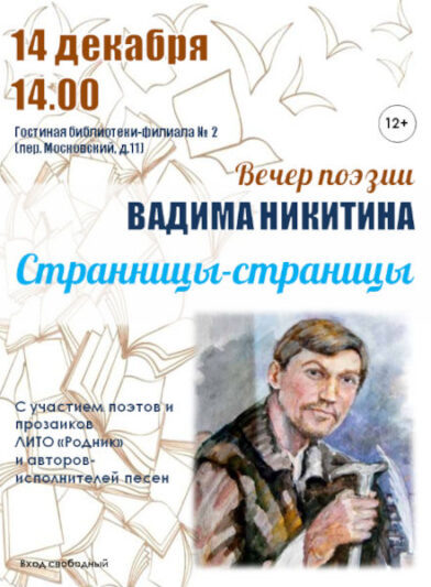По традиции в честь этой даты его верные читатели, друзья и близкие собираются в гостиной библиотеки-филиала № 2 (пер. Московский, д.11). На этот раз, по просьбе Вадима Александровича, встреча, названная «Страница-странница», состоится 14 декабря (воскресенье) в 14:00. Если самочувствие позволит (а мы очень на это надеемся), Вадим Александрович будет присутствовать на встрече. Так или иначе, мы поговорим о его творчестве, адресуем ему тёплые слова и лирические посвящения и, следуя просьбе поэта, почитаем стихи (уверены, что у каждого ценителя его творчества есть любимые) и исполним песни на его строки. И пусть свеча по имени Вадим Никитин продолжает светить!