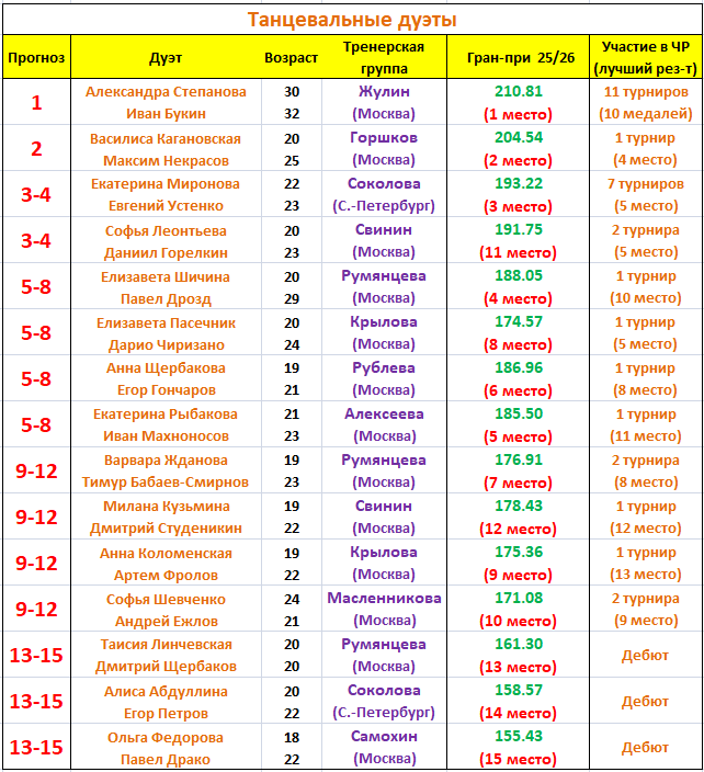 В танцах состав участников Чемпионата России можно условно разделить на две равные группы. Первые 8 дуэтов в табличке выше будут претендовать на место в основном составе сборной России (Топ-6), а также на пьедестал почета. Задача-максимум остальных семи дуэтов - постараться показать "прокаты-жизни", вопреки моим прогнозам, которые основаны на судейских оценках, войти в Топ-8 и претендовать на место в резервном составе сборной России. Дебютанты вряд ли окажутся высоко, а наиболее близко к этой цели находятся четыре пары, которым я прогнозирую места с 9 по 12. Не радуют пока своими баллами Софья Шевченко/Андрей Ежлов. Выделяются своими программами, грубых ошибок не допускают, но по своему лучшему результату на Гран-при занимают лишь 12 место.
