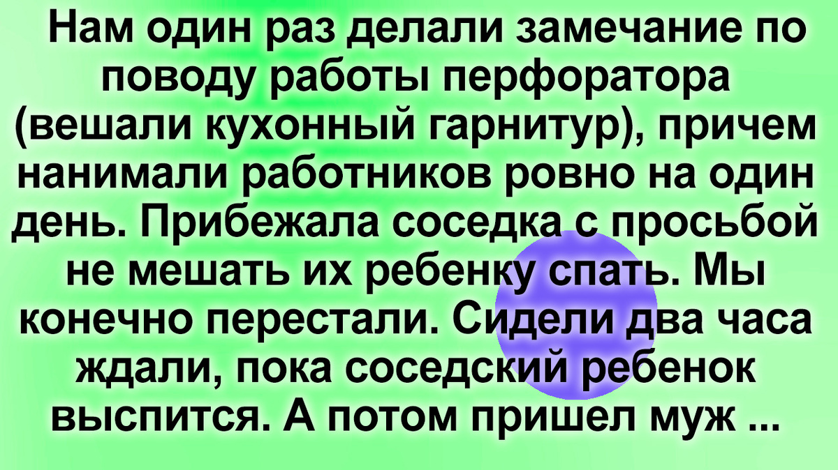 Особенно мне нравится - когда днем делаешь ремонт - взяли за правило бегать - и требовать прекратить работу - дите спит. А когда же ремонт делать, ночью? К нам приходила бригада с 9 утра и до 18 часов делала ремонт. Имею полное право. Ни один из соседей не пришел, и не сказал - что ребенок у меня спит.