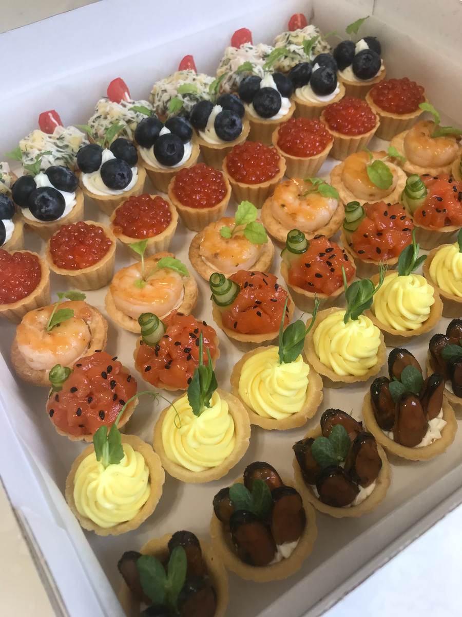 Готов фуршетный бокс на корпоратив "7 вкусов". Очень достойно выглядит, не трудозатратный по исполнению. Сделали и украсили за 2,5 часа. Состав: семга, мидии, икра, креветки, сырно-яичный мусс, карбонат-сыр и 8шт десертных - сладкий творожный крем с голубикой. И всякие секретики)), где-то крошечка куркумы, где-то капелька кисло-сладкого соуса, где-то черный тмин. Делали утром, чтобы к часу отдать, потом внучка проснулась, выдали ей подломанные тарталетки, из остатков в кондитерских мешочках она навалила туда все что было, сверху наложила всяких неликвидов и гордо на тарелочку подала: "Я пЬиготовила, вкуТНЯ?" Накормила, вообщем))