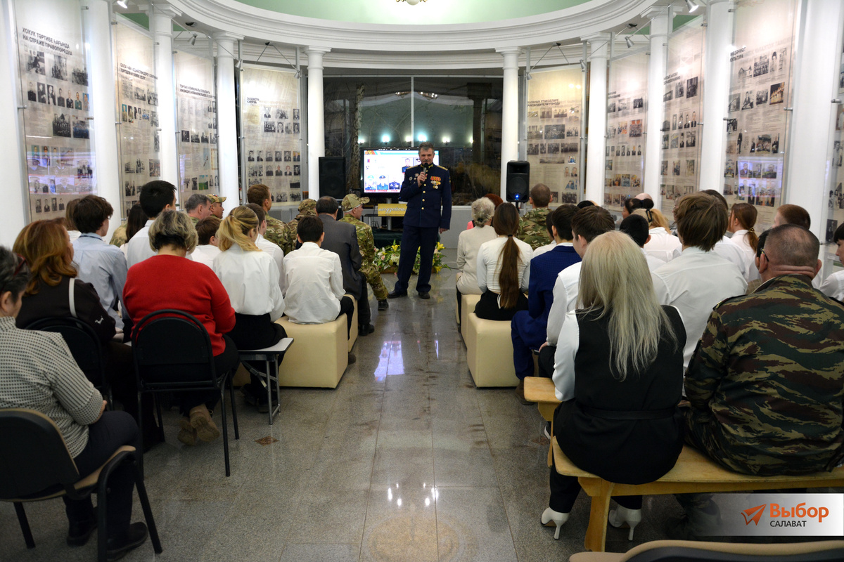 В преддверии Дня героев Отечества прошел урок мужества, организованный сотрудниками МБУ К и И «Наследие» и участниками патриотического клуба «СВОи Герои» библиотеки «Своя химия». В зале — почетные гости: среди них — ветераны СВО и их семьи, председатель Совета ветеранов Суфия Зидиханова, депутат, социальный координатор филиала госфонда «Защитники Отечества» Сергей Данилов, советник главы администрации города по вопросам СВО, председатель Ассоциации ветеранов СВО Марат Хасанов и другие.