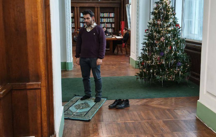 В стенах Российской государственной библиотеки, которая является одним из главных культурных и научных центров страны, произошел инцидент, вызвавший широкий общественный резонанс. Два молодых человека, один из которых был запечатлен на фото, устроили несанкционированную акцию, расстелив молитвенный коврик прямо в центральной части одного из залов. Происшествие привлекло внимание посетителей, поскольку место было выбрано намеренно — на самом виду, рядом с установленной новогодней ёлкой. Подробности инцидента и участники По словам очевидицы, которая и запечатлела происходящее, двое молодых людей намеренно провели акцию, которую она назвала «намазом» или политической акцией. На фотографии видно одного из участников инцидента: это молодой мужчина с короткой бородой и темными волосами. Он одет в бордовый свитер, под которым виднеется светлая рубашка с темным платком, повязанным на шее. На нем темные брюки и черные носки, а обувь, туфли, аккуратно снята и стоит рядом. Молодой человек стоит