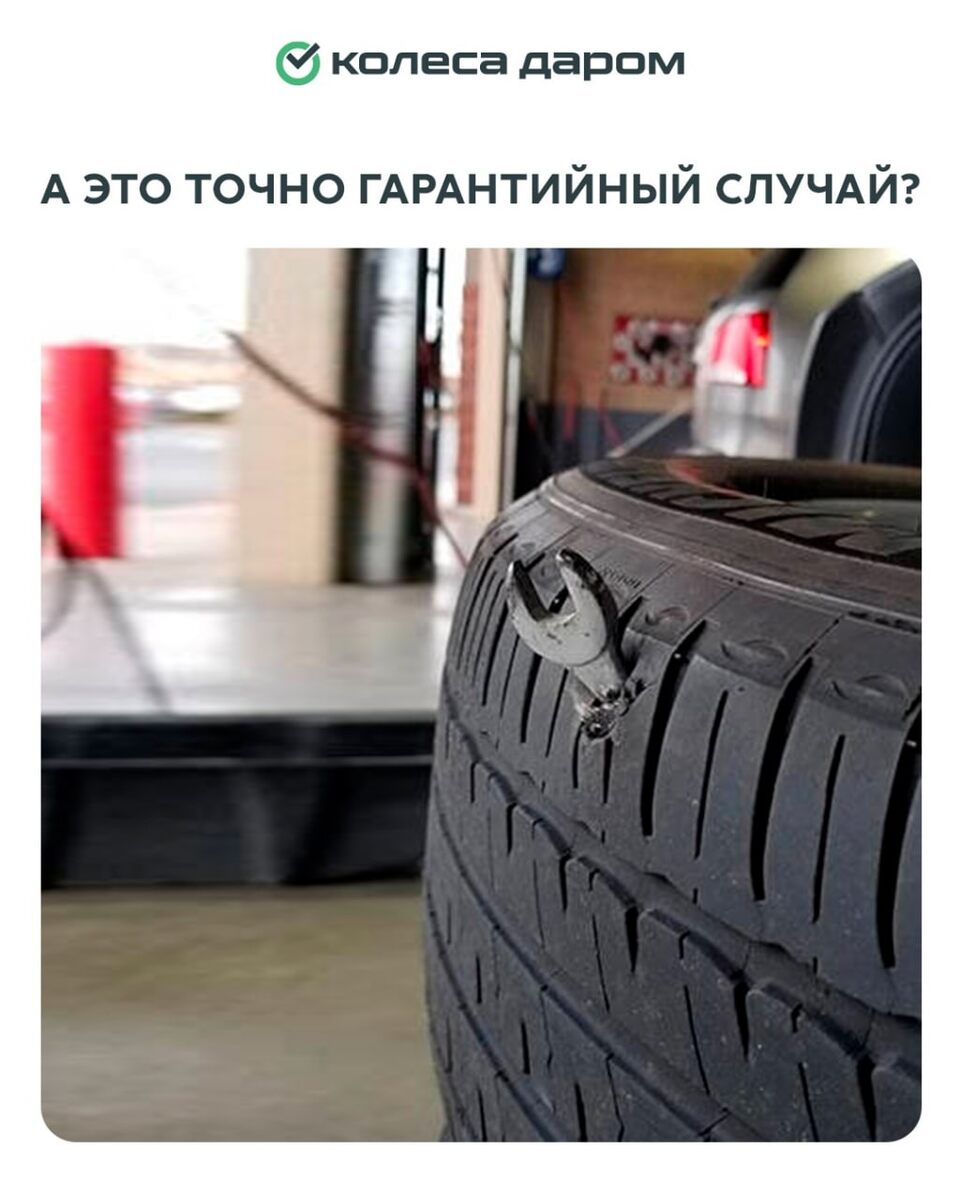 Расширенная гарантия на шины — ремонт или замена бесплатно 🛡👉 Прокол, порез или вздутие боковины — с шинами может случиться всё что угодно. Особенно зимой. С расширенной гарантией от «Колёса Даром» мы бесплатно отремонтируем повреждённую шину или заменим её на новую. Никаких лишних расходов — мы берём на себя. Что входит в гарантию: ✔️ Ремонт в сертифицированных центрах ✔️ Обмен на аналогичную шину ✔️ Обмен на другую модель с доплатой ✔️ Возврат денег Условия и сроки зависят от бренда шин. Программа действует на территории РФ. Подробности и список брендов — на нашем сайте. ☝ Хорошая гарантия — как запасное колесо: надеешься, что не понадобится, но спишь спокойнее