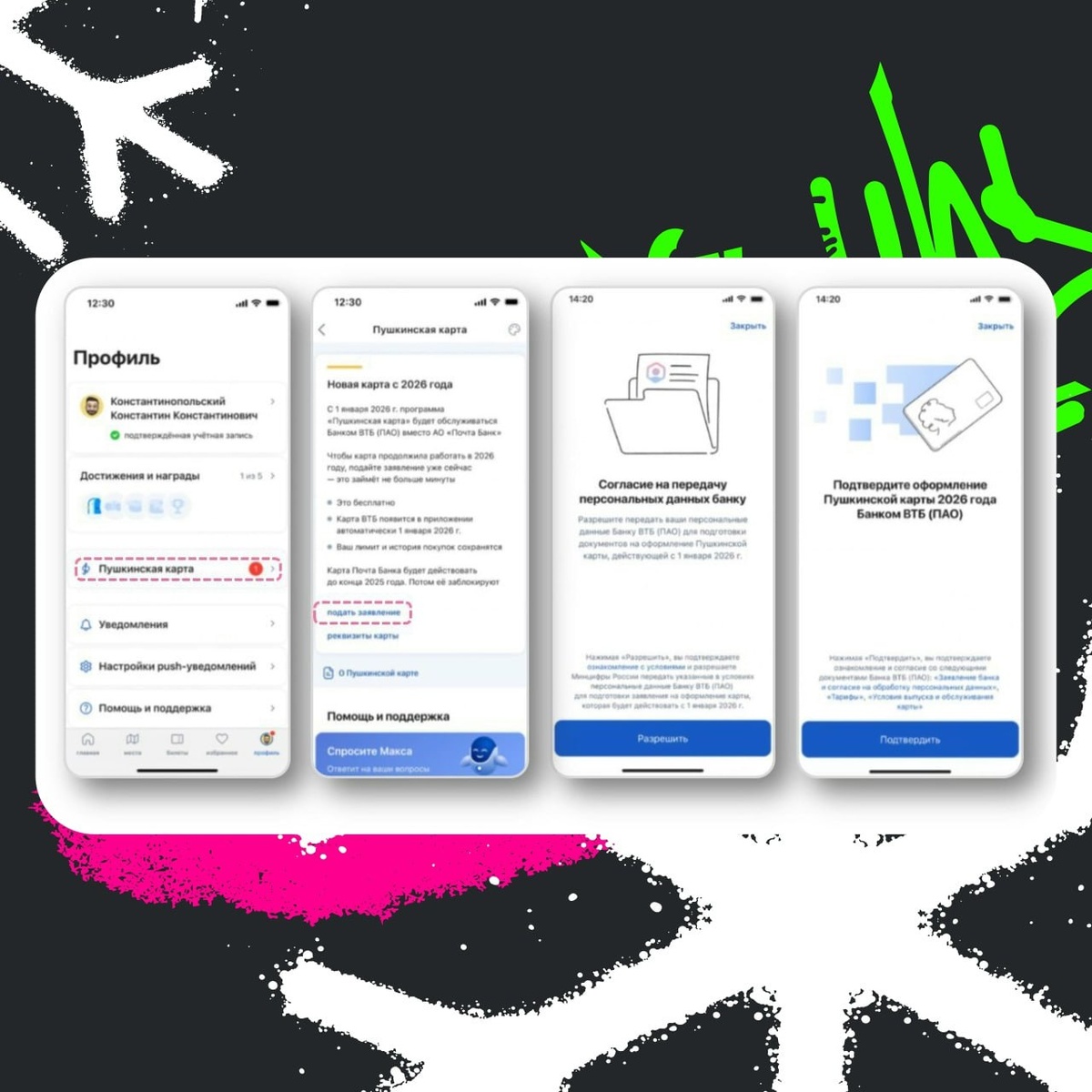 Тебе уже 14 и нет 22? Подготовили для тебя маленькую шпаргалку, чтобы ты точно подал заявление на выпуск Пушки в ВТБ, и у тебя и в следующем году была возможность ходить по ней в кино, театр и музей 🧣 Подать заявление на выпуск карты в ВТБ до 28 декабря 2025 года включительно можно: • в мобильном приложении «Госуслуги Культура» • в мобильном приложении Почта Банка