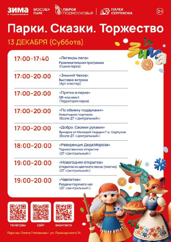✨ Фестиваль "Парки. Сказки. Торжество" ❄️С 17:00 до 20:00 👉Развлекательная программа "Легенды леса" 👉Выставка-витрина "Зимний вечер" 👉Тематические фотозоны 👉Ярмарка 👉Торжественное открытие Резиденции Деда Мороза 👉Создание открытки из цветного песка "Новогодняя открытка" 👉Раздача горячего чая "Чаепитие" 🚫 Возраст: 0+ 📆 13.12.2025 🏢 Парк им.Олега Степанова 📍 г. Серпухов, ул. Луначарского, д.74 💰 Вход свободный❗️ ⭐Поддержать канал голосом 💰 Канал Вакансии Серпухова ✅ Мероприятия Серпухов https://dzen.ru/id/66f01c6eb4c6fe60c9ca1608 http://vk.com/serpukhov_events http://dzen.ru/serpukhov_events