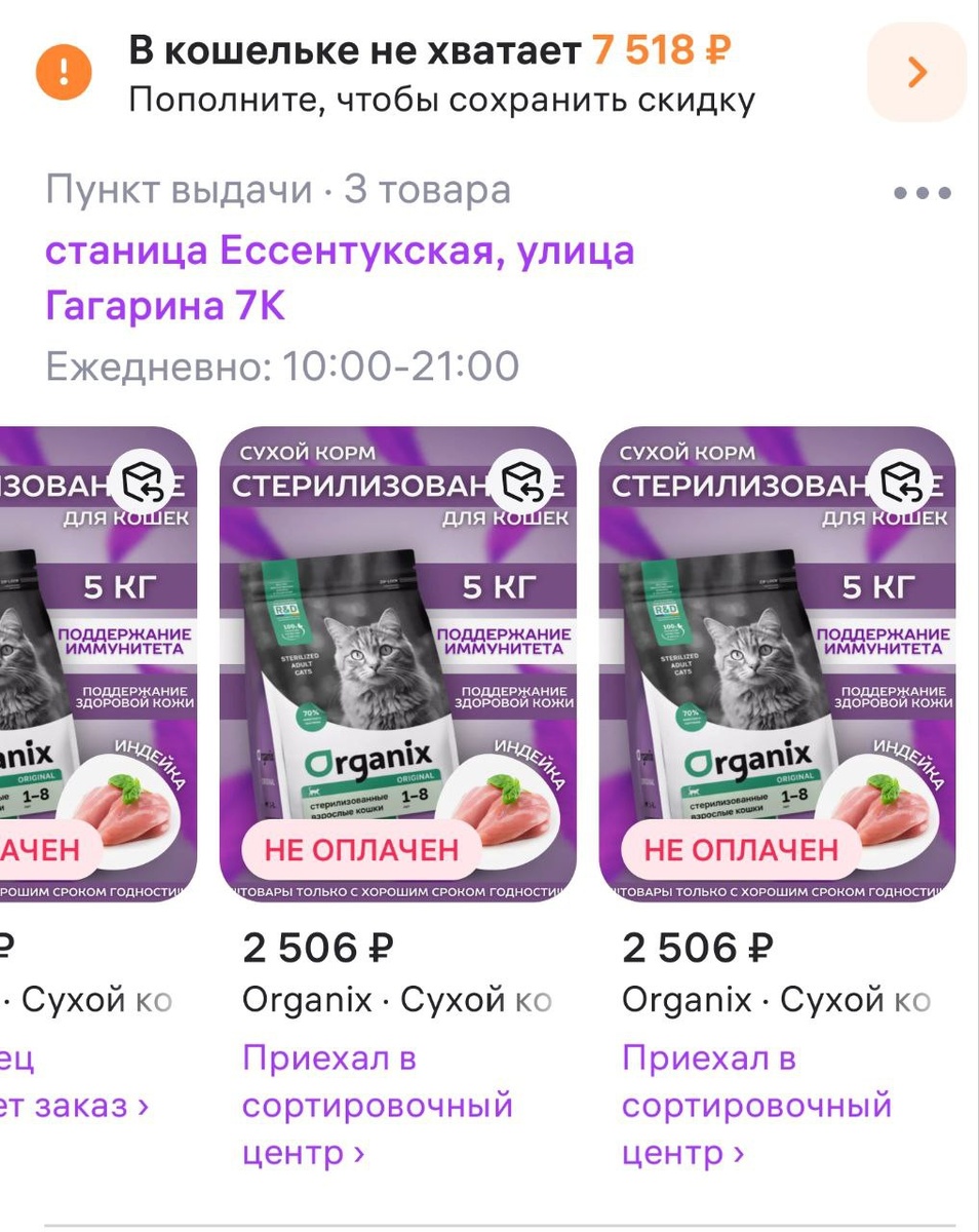 Очень жду, что сегодня приедет 2 пакета корма 🙏🏼 Но он с оплатой при получении. Сплит нам везде отключили. Заказала ещё один пакет, так же с оплатой при получении. Ещё попросили до субботы оплатить передержку Дикси 5000 р. 🙈🙈🙈