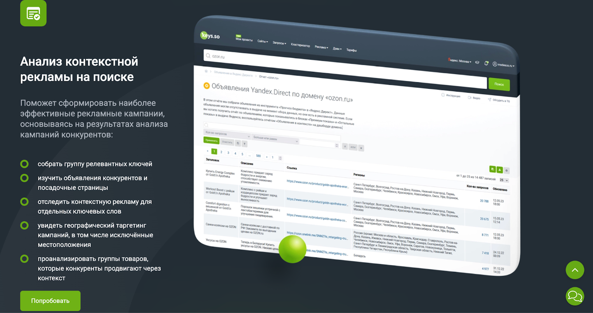 На бесплатном доступе можно просматривать часть отчётов, проверять домены, смотреть выборочные запросы и конкурентов. Ограничения жёсткие, но использовать keys so бесплатно всё же возможно, если задача — быстро оценить нишу или протестировать функционал перед покупкой тарифа. Полноценные выгрузки, расширенные отчёты, работа с большими семантическими списками и анализ контекстной рекламы уже требуют тарифного доступа.