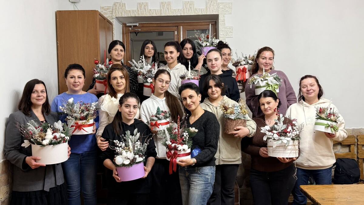В культурном центре «Диалог» царила подлинная атмосфера праздника. На столах — елочные ветки, шишки, игрушки, фонарики, красные ягоды на веточках, маленькие птички, свечи. Конечно, всё это было искусственным, но удивительное дело: каждый присутствующий словно ощущал настоящий хвойный аромат — будто бы в воздухе витал запах приближающегося снега. А за окном тем временем стояла пасмурная погода, и ни одной снежинки не было видно. Прогноз обещал ливневый дождь, и были опасения, что мастер-класс «Новогоднее чудо своими руками» культурного и образовательного фонда «Кирс» может не состояться. Но повезло… Хотя, как сказала одна из юных участниц мастер-класса: «Если бы был ливень, я бы всё равно приехала». Настолько всем нравятся мастер-классы «Кирса», которые при поддержке организации «Диалог» проводятся для арцахцев и друзей Арцаха. В этот раз мастер-класс под названием «Новогоднее чудо своими руками» провела Софья Мелкумян. В Степанакерте у неё был успешный цветочно-дизайнерский бизнес; о