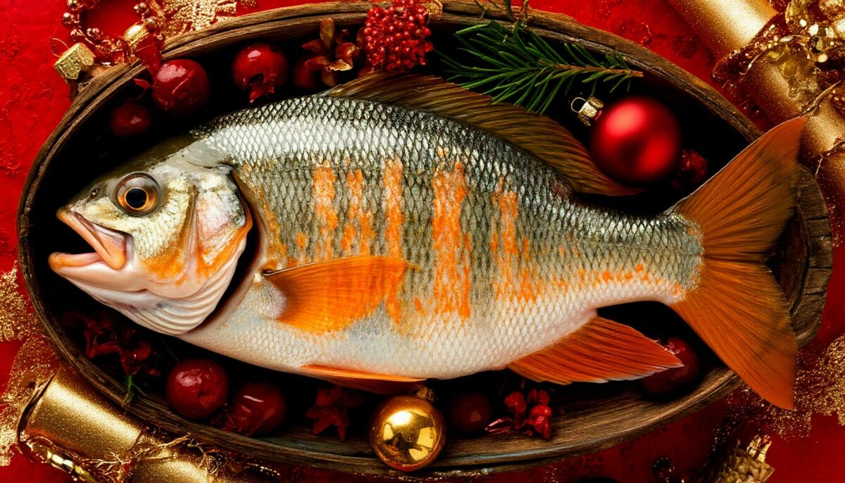 На новогоднем столе рыба занимает особое место благодаря своей символичности и вкусовым качествам. Вот несколько популярных вариантов рыбных блюд на Новый год: ### Закуски: 1. **Салат с рыбой**: - Например, салат с семгой, авокадо и огурцом, заправленный лимонным соком и оливковым маслом. 2. **Канапе с красной рыбой**: - Ломтики багета, сливочный сыр и тонко нарезанная красная рыба. 3. **Филе рыбы под маринадом**: - Филе трески или минтая, замаринованное в смеси уксуса, растительного масла, лука и специй. 4. **Закуска с сельдью**: - Классический вариант — селедка под шубой или бутерброды с филе сельди и свежими овощами. ### Горячие блюда: 1. **Запеченная рыба с травами**: - Целая запеченная рыба (например, судак или форель) с лимоном, розмарином и чесноком. 2. **Жареная рыба в панировке**: - Рыбные стейки, обжаренные в сухарях или льезоне, с гарниром из овощей гриль. 3. **Фаршированная рыба**: - Рыба, фаршированная грибами, луком и зеленью, запеченная в духовке. ### Десерты и закуски: