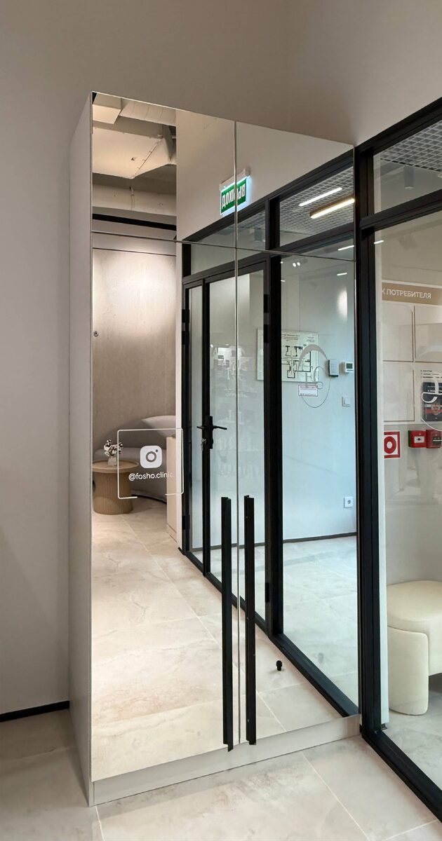 Современное бьюти-пространство — это мир, где эстетика работает на доверие. Клиентка может ещё не успеть присесть в кресло мастера, но уже понимает, останется ли она в этом салоне. Ни одна женщина не доверит свою внешность месту, где мебель выглядит случайной или устаревшей. Когда интерьер собран со смыслом, он становится продолжением бренда и подчеркивает профессионализм мастеров. Недавно мы завершили большой индивидуальный проект, в который вошло всё, что формирует функциональную и визуально цельную студию красоты. Команда дизайнеров и мастеров работала над каждым элементом: от зоны встреч клиентов до технических помещений. Мы изготовили два высоких шкафа с зеркальными распашными дверьми, которые стали частью общей геометрии помещения. Их отражающие плоскости помогают создавать ощущение пространства и поддерживают световую композицию салона. Рядом расположилась стеклянная витрина с зеркальной задней стенкой. Мы задумали её не как отдельный акцент, а как продолжение той же идеи — лёг