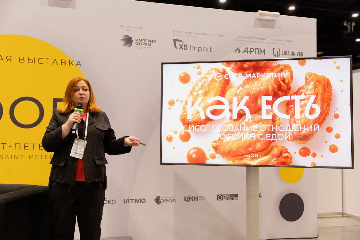 В 2025 году СберМаркетинг провёл масштабное исследование, чтобы понять: как россияне на самом деле относятся к еде — не на уровне рациональных решений, а на уровне чувств, ценностей и жизненных обстоятельств. В рамках деловой программы выставки «Петерфуд» Елена Голубева поделилась итогами исследования. И вот, что мы узнали. Еда как функция — новая норма? 56 % россиян воспринимают еду как функцию: нечто необходимое, лишённое ярких эмоций. Это способ «просто не упасть к обеду», а не повод для удовольствия или сближения. За этой цифрой скрывается сложная и динамичная картина. Исследование выявило шесть смысловых сегментов, отражающих разные роли еды в жизни людей. Причём один и тот же человек может одновременно находиться в нескольких таких сегментах: в зависимости от возраста, дохода, состояния здоровья, жизненных событий или даже просто от настроения в конкретный день. Шесть отношений россиян к еде: Еда как функция (56 %) — рутина, стабильность, отсутствие эмоций Еда как необходимость,