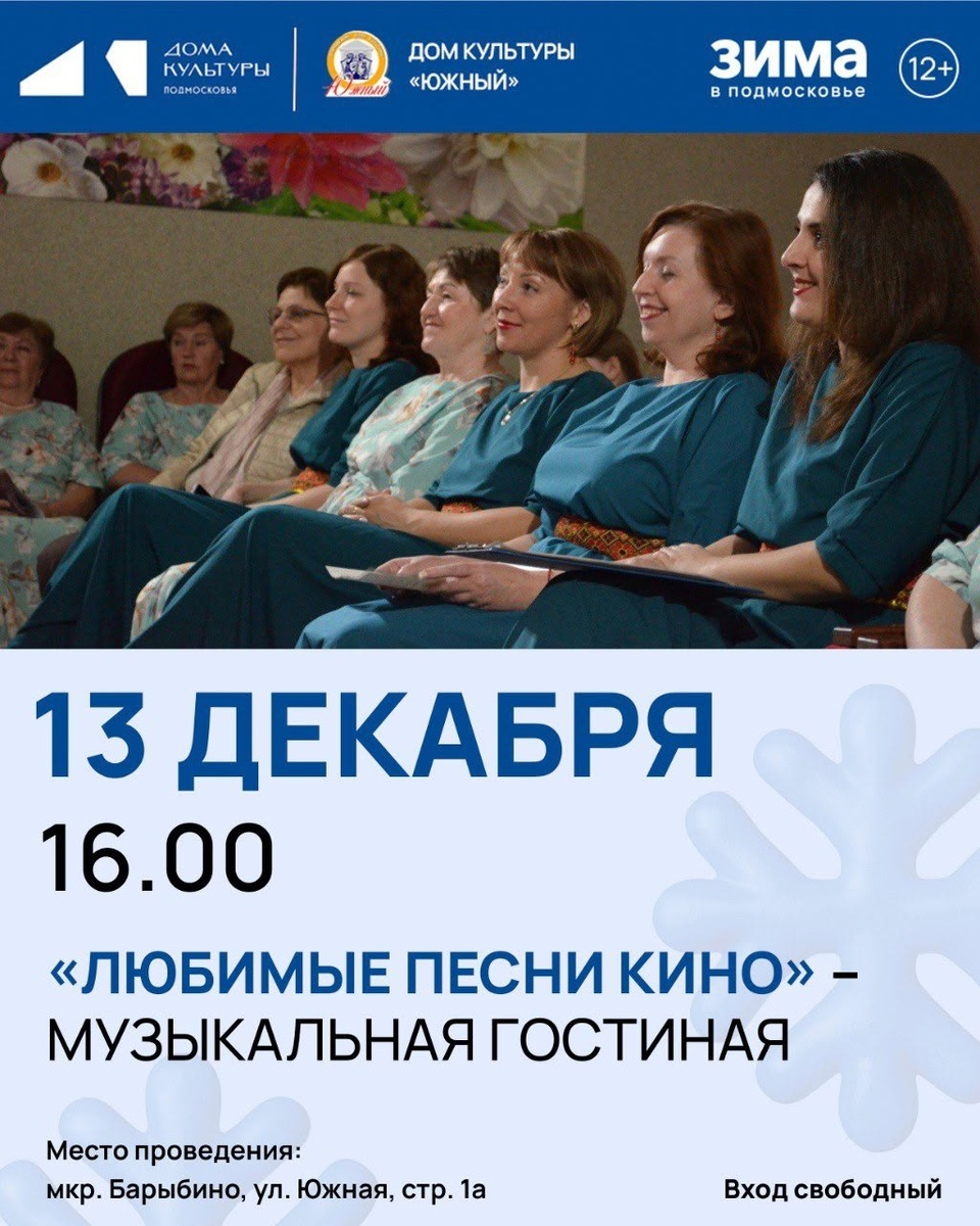 ✨ Дорогие друзья! Приглашаем вас на музыкальную гостиную «Любимые песни кино» 🎶🎤 🚫 Возраст: 12+ 📆 13.12.2025🕒16:00 🏢 Городской дом культуры «Южный» 📍 г.о.Домодедово, мкрн.Барыбино, ул.Южная, стр1А 💰 Вход свободный❗️ ✅ Мероприятия Домодедово https://dzen.ru/id/66f10385cc4c5a16f7b5fb02 http://vk.com/domodedovo_events http://dzen.ru/domodedovo_events