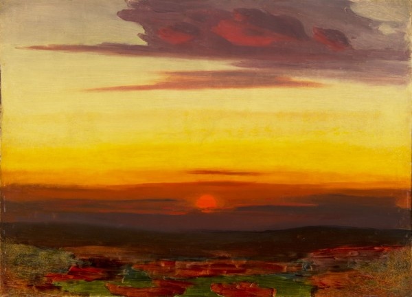 Полыхает небо за Днепром. День ушёл. Есть время на привал. Мысли соберу, займусь письмом. Извини, давно не отвечал. Что же написать? Мелькают дни, Пункты населённые, бои. Что писать? Я помню каждый миг Руки, губы и глаза твои. Млечный Путь и красноватый Марс. Тёплая твоя ладонь в моей. Видно было ясно, как сейчас, Только тишина и соловей. Помнишь, в область ездили? Футбол. Сбор команды за четыре дня. Но сыгрались, и кураж пришёл. Ты тогда болела за меня. Скоро за работу. Извини. На часок прилягу в блиндаже. Снова о войне и о любви Незачем. Написано уже. А.И. Куинджи «Закат» 1900-е Государственный Русский Музей